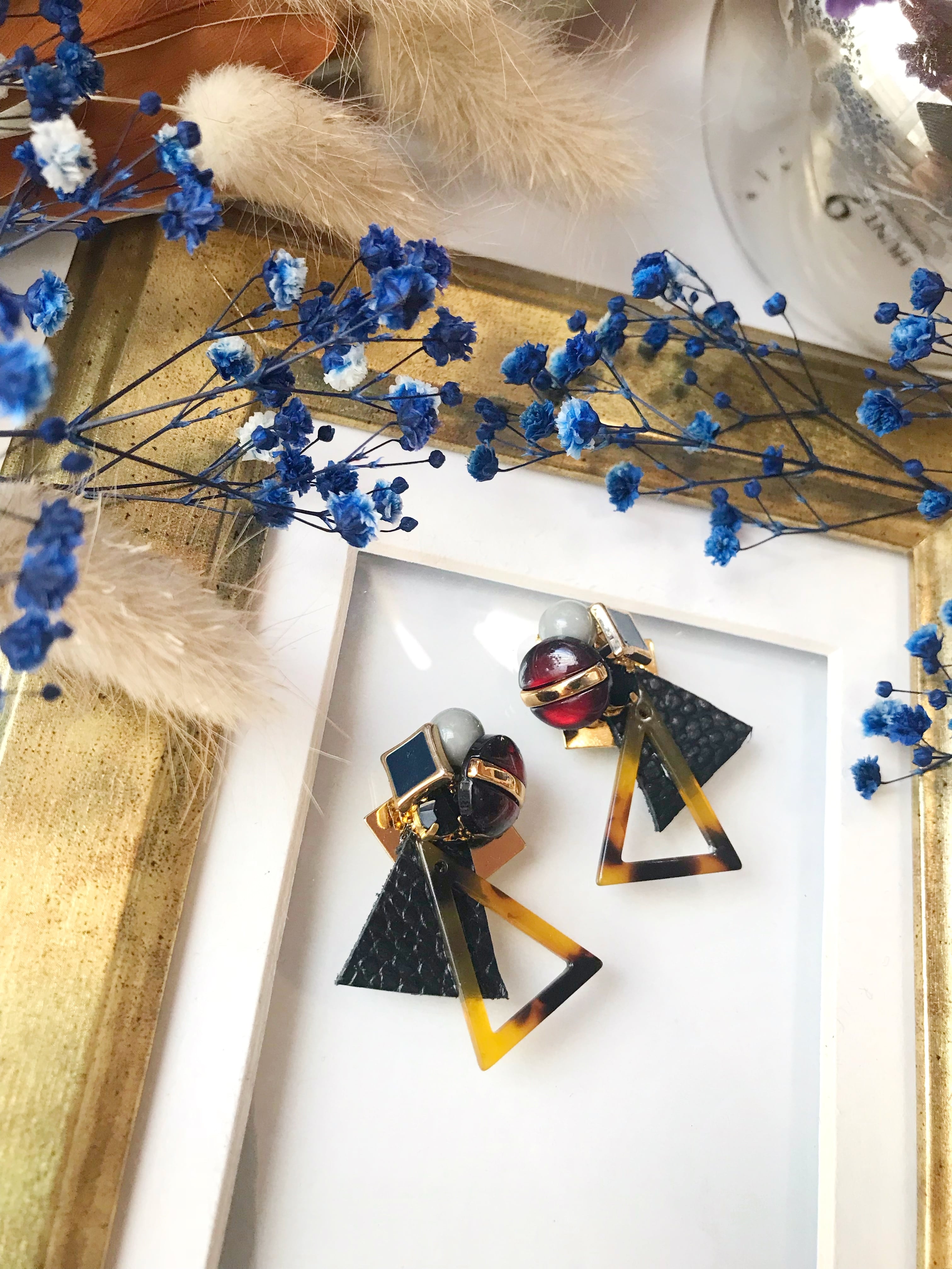 牛革のレザーを使った個性的なピアス!ビジューは秋冬をイメージしてべっ甲を足してさらに秋冬らしくしました(*´꒳`*)