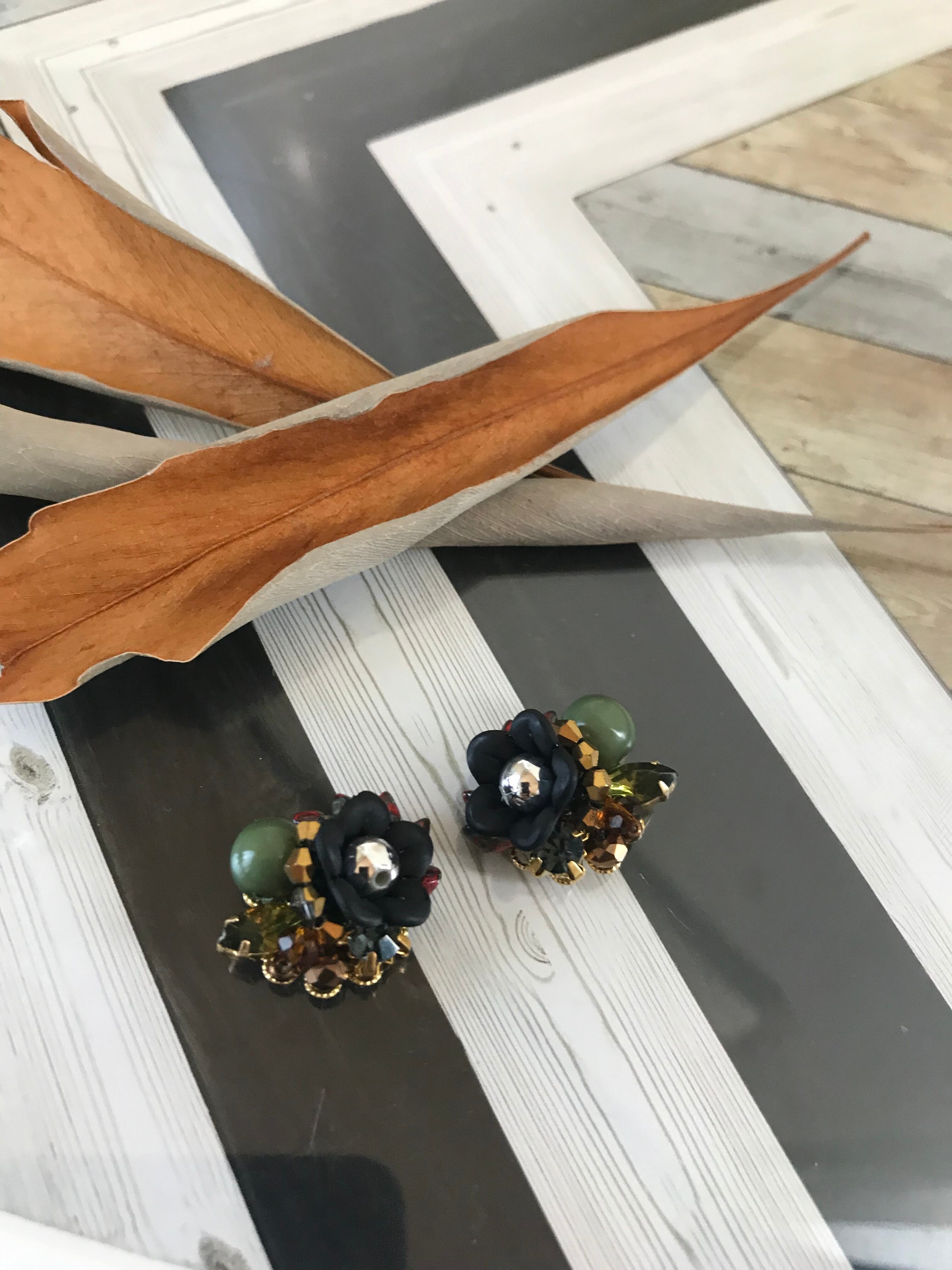 黒のお花のパーツと様々な色のビーズたちで秋色大人ビジュー作りました(*´꒳`*)
