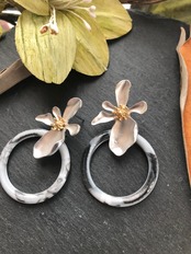 シルバーの大振りのお花のパーツに大理石風のマーブル模様がクールなサークルパーツを使用して、シンプルでカッコいいピアスにしました(*´꒳`*)