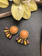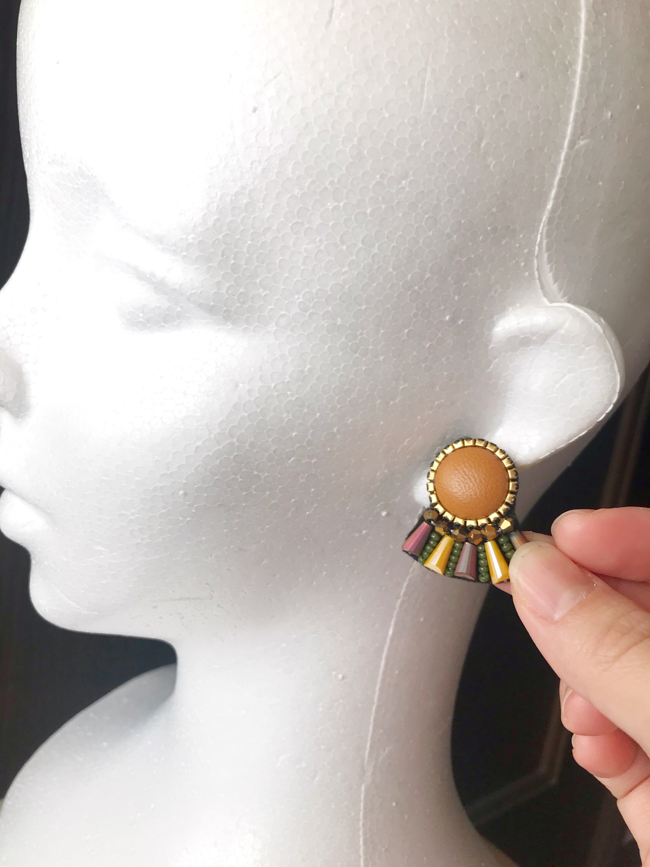 キャメルのレザーカボションの周りをラインストーン で囲んで太陽のようにビーズ達を刺繍しました(*´꒳`*)