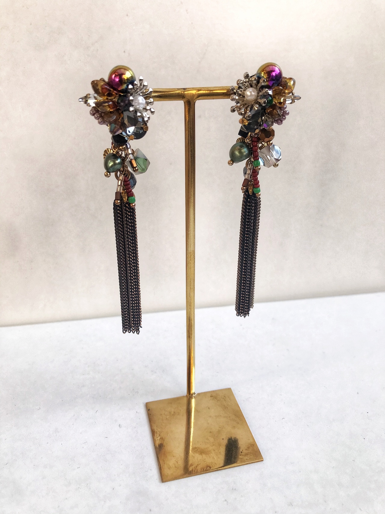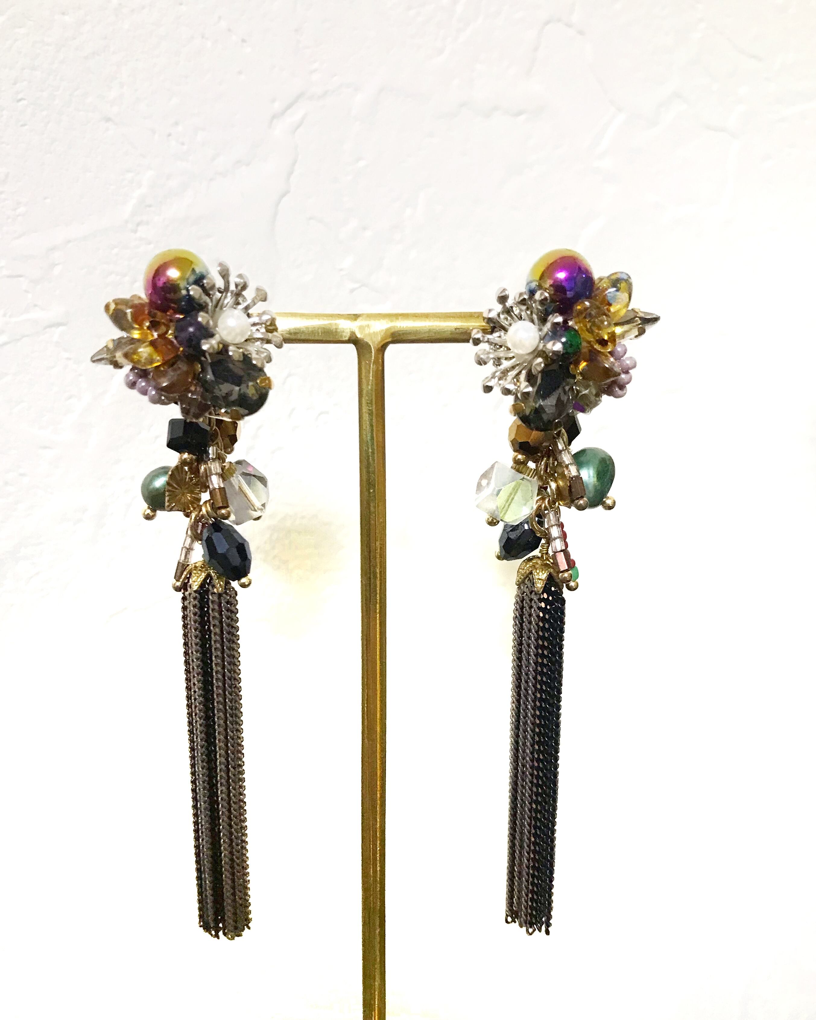 さまざまな輝きをのビーズ達でビジューを作りチェーンタッセルを使用して豪華に仕上げました。